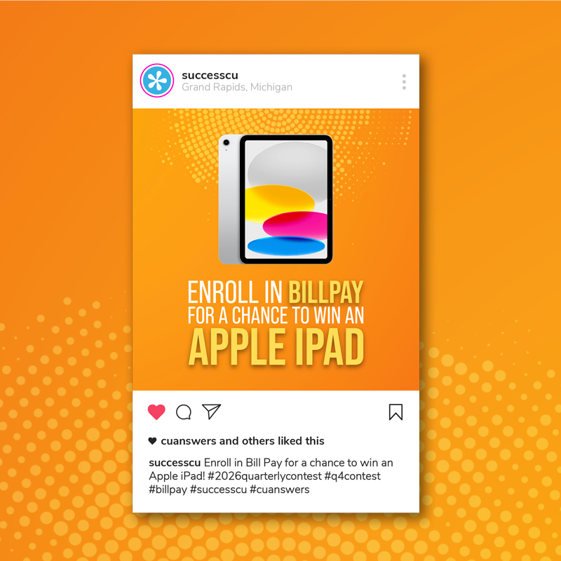 The Bill Pay contest runs from October 1, 2026 – November 30, 2026 and is free for all our client credit unions. Members will be entered in to win one (1) Apple iPad 11 Inch 256 GB.