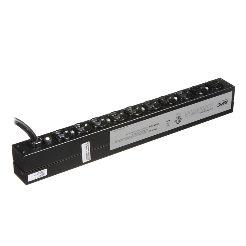 Basic Rack PDU (1RU) Rackmount Power Strip designed for use in rackmount environments, featuring 10 NEMA 5-20R outlets, drawing power via NEMA 5-20P plug. The PDU is compatible with North American 120V voltage, with total load capacity of 2400 VA. 12′ power cord.